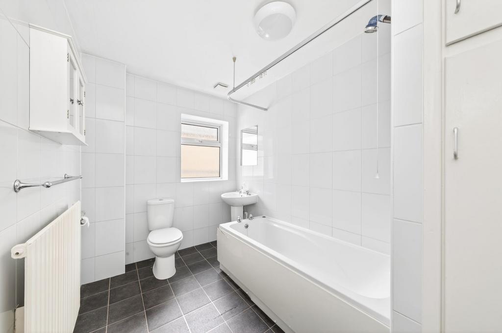The bathroom features a white three-piece suite, which comprises of a low-level WC with push-button flush, pedestal wash hand basin, and a panel bath with electric Briston Thrill shower over. There are fitted cupboards providing a great deal of storage for toiletries and towels, ceiling light, extractor fan, central heating radiator, and a double-glazed window with obscure glass and tiled surround to the side elevation.