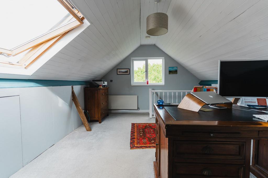 Moving upstairs to the first floor, the main bedroom is a generous space with enough room for a super king sized bed, fitted wardrobes and a dressing table. Whilst the second bedroom looks out over the garden at the rear and is also a very comfortable double room. The recently refitted family bathroom has an attractive suite with rain shower, wc, large basin and a heated towel rail. From the landing, a staircase leads up to the second floor where you’ll find the third double bedroom in the original loft space, a large room with Velux and side windows. From here you can enjoy the most amazing countryside views and even further eaves storage.