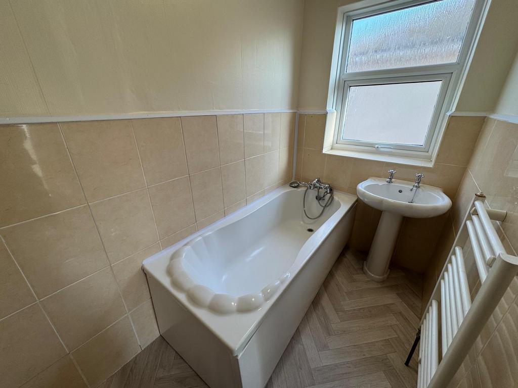 Panelled bath with mixer shower tap, Pedestal wash Hand basin, Part tiled walls, uPVC double glazed window, Towel heater radiator.