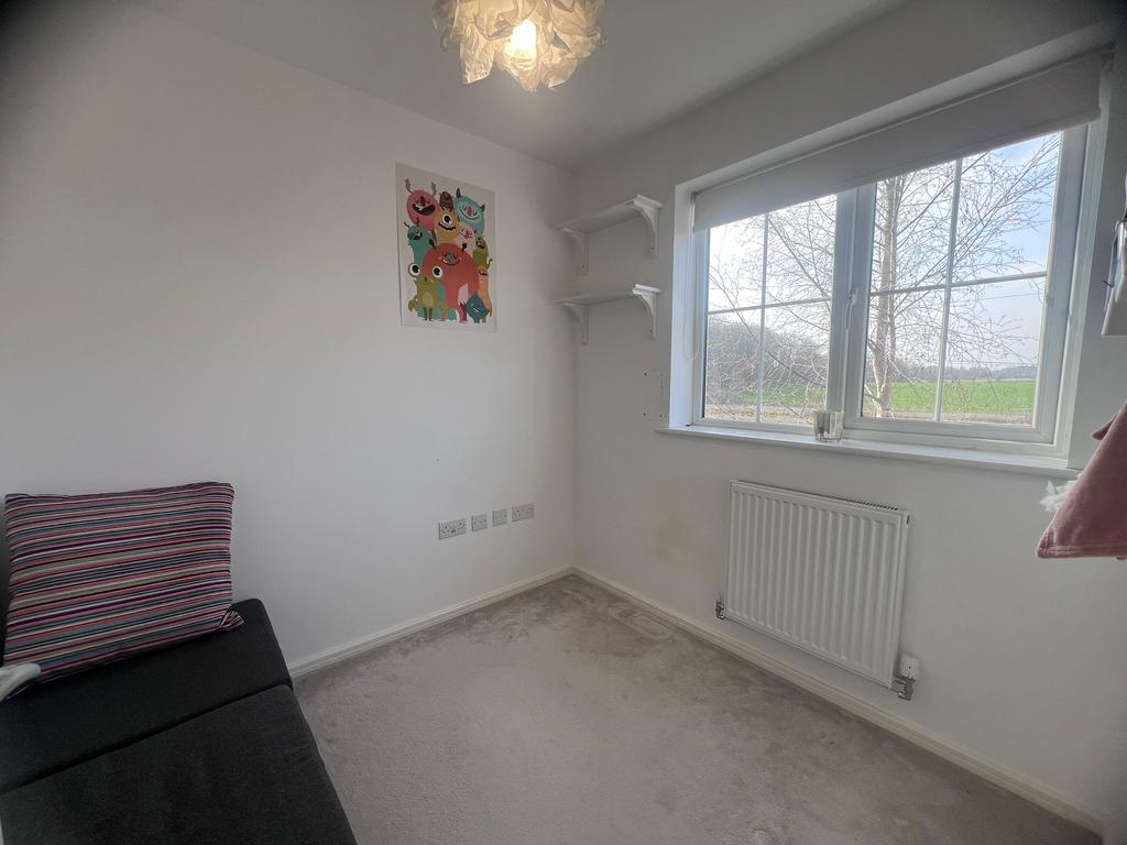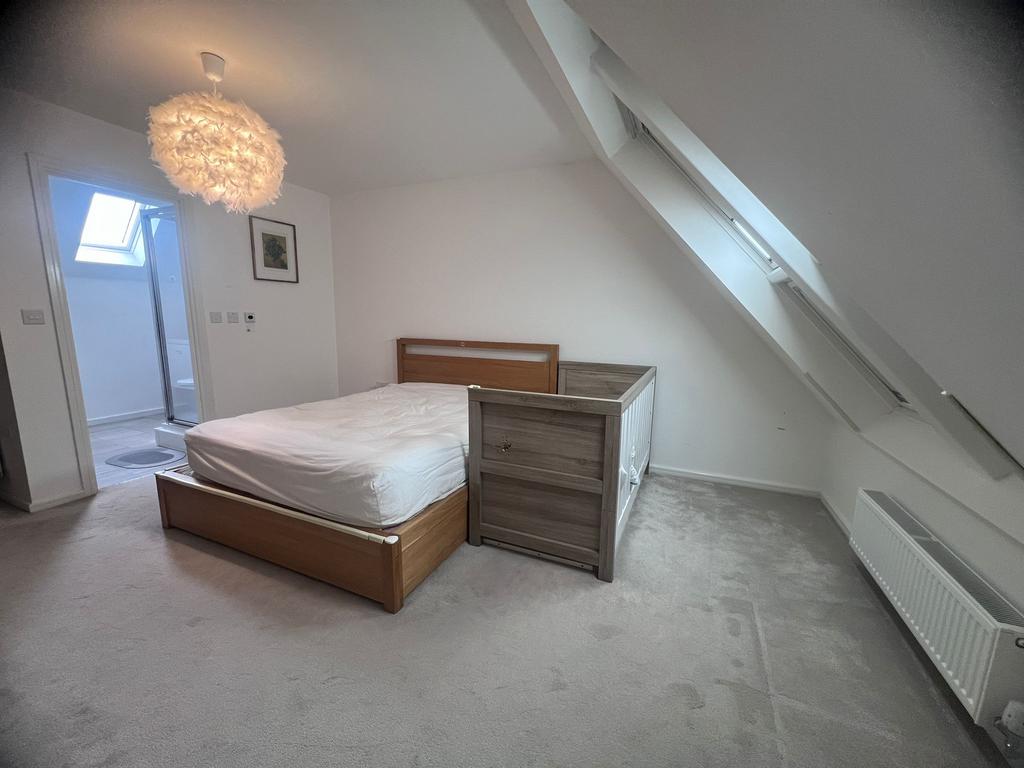 The property comprises three bedrooms arranged over the upper floors. The second-floor bedroom benefits from its own ensuite bathroom and additional skylight windows.