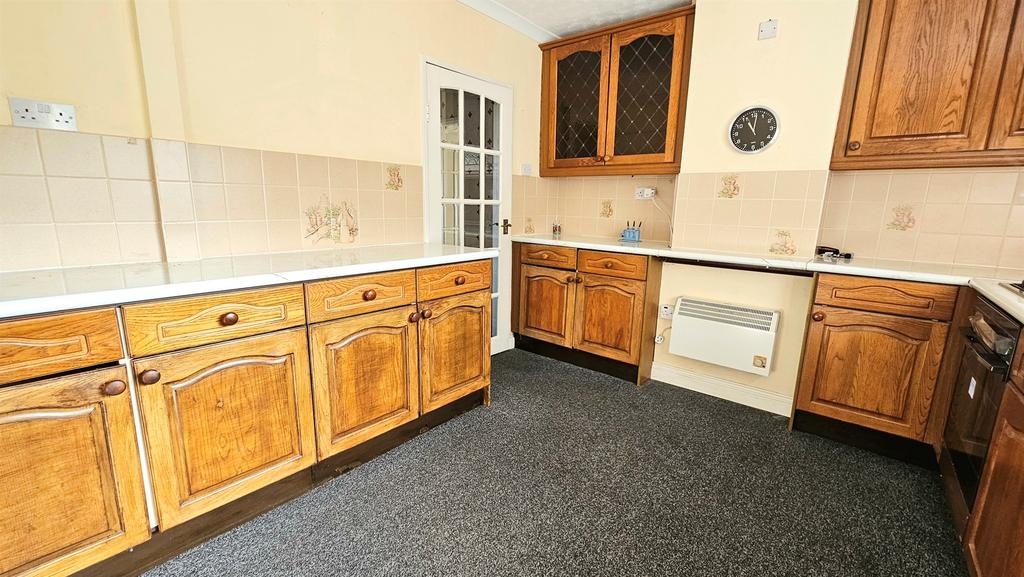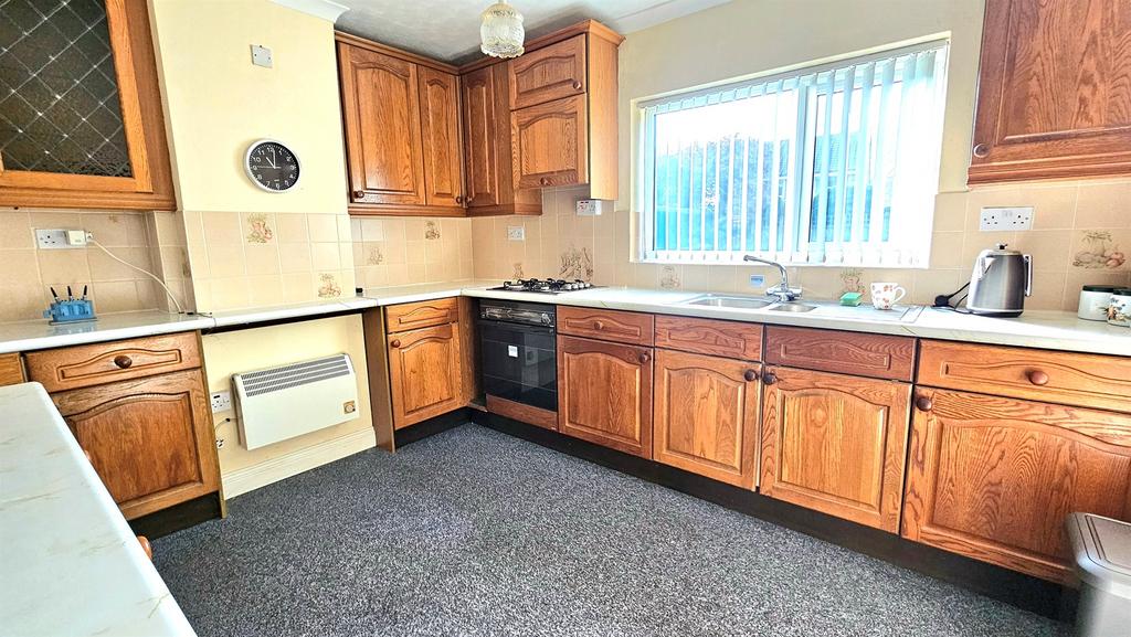 Having a UPVC double glazed window to front, this kitchen offers wall and base units incorparting worksurfaces over, electric oven, four ring gas hob, radiator and tile carpet flooring.