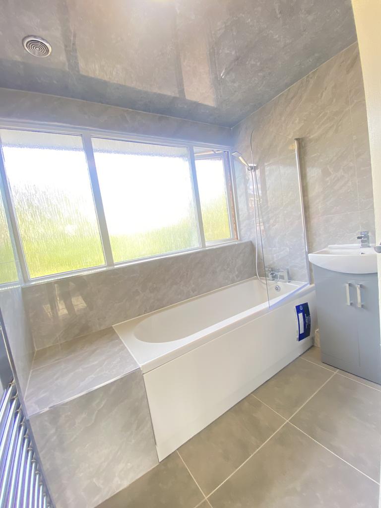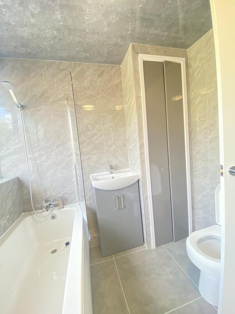 A refitted bathroom featuring a modern suite including a bath with overhead shower, wash basin, and WC, designed to provide convenient facilities for everyday family use.