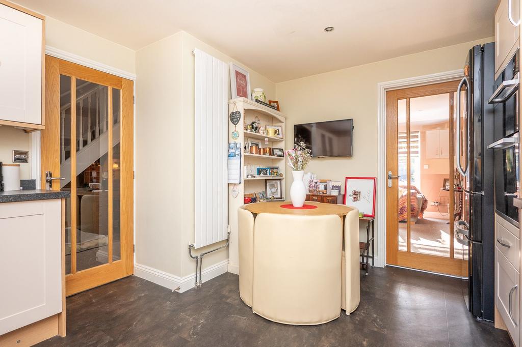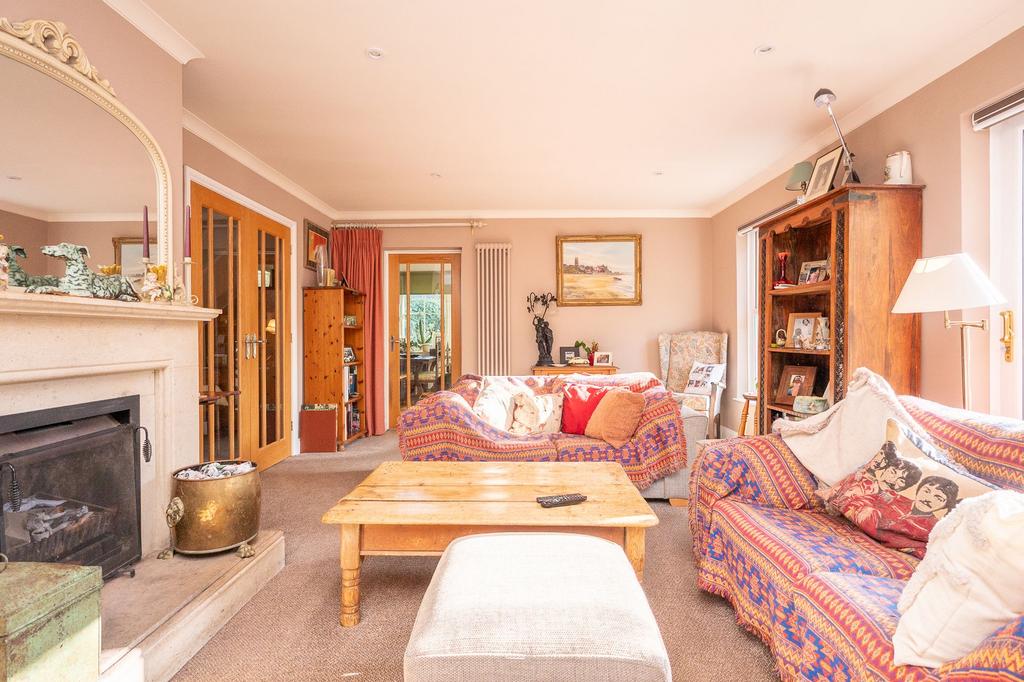 Double-glazed windows to the rear aspect overlook the garden, with sliding patio doors providing access to the rear patio. The room features an open fireplace with a marble surround and mantelpiece, along with TV and satellite points and wall-mounted radiators. Glazed oak doors lead through to the dining room and the kitchen–breakfast room. Inset ceiling downlights complete the space.