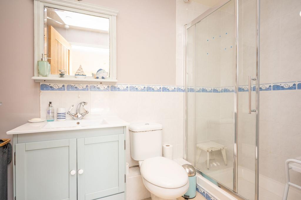 The en-suite has a shower, low-level dual flush WC and a vanity wash hand basin. Towel rail heater and inset ceiling downlights.