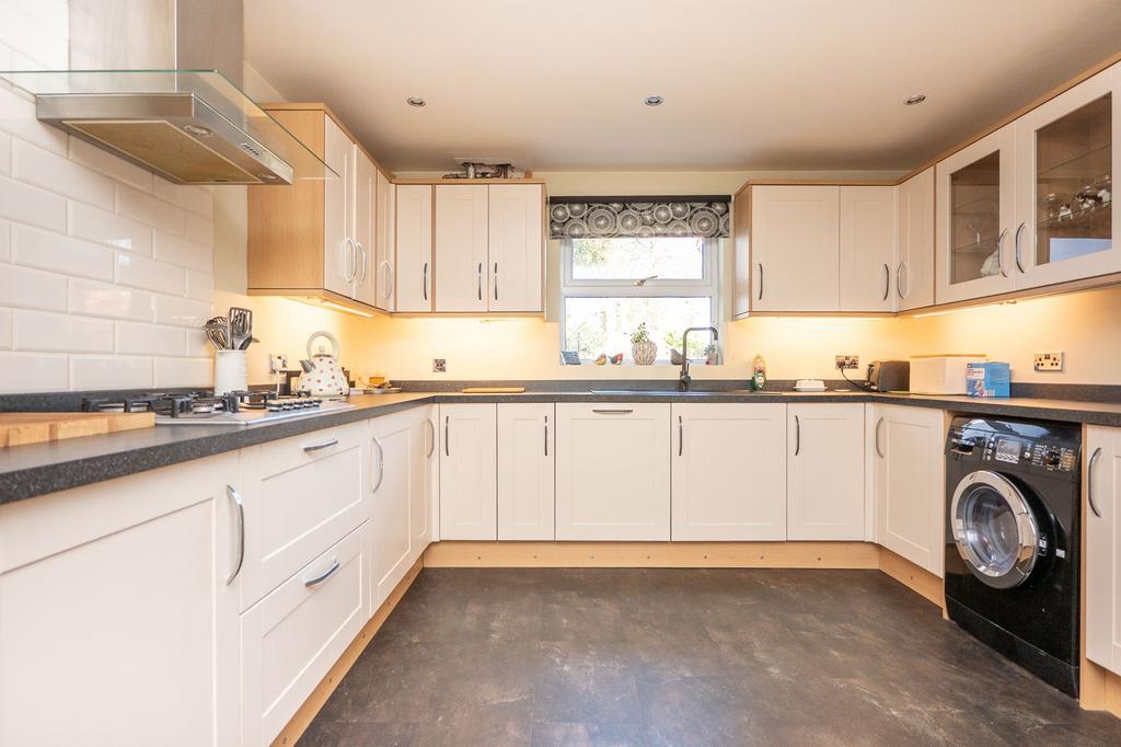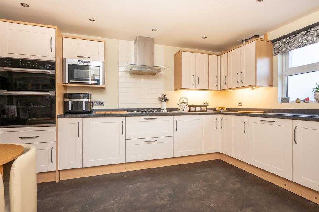 Double-glazed window to the front aspect. The kitchen is fitted with a range of base and wall-mounted units with worktops over. Integrated appliances include a five-ring gas hob with extractor hood and downlight above, an electric double oven with grill, and a dishwasher, with additional space and plumbing for a washing machine. There is an inset sink with draining board, plinth LED lighting, and under-cupboard downlights. Further features include inset ceiling downlights, a vertical radiator, tile-effect vinyl flooring, a TV point, and space for an American-style fridge freezer.