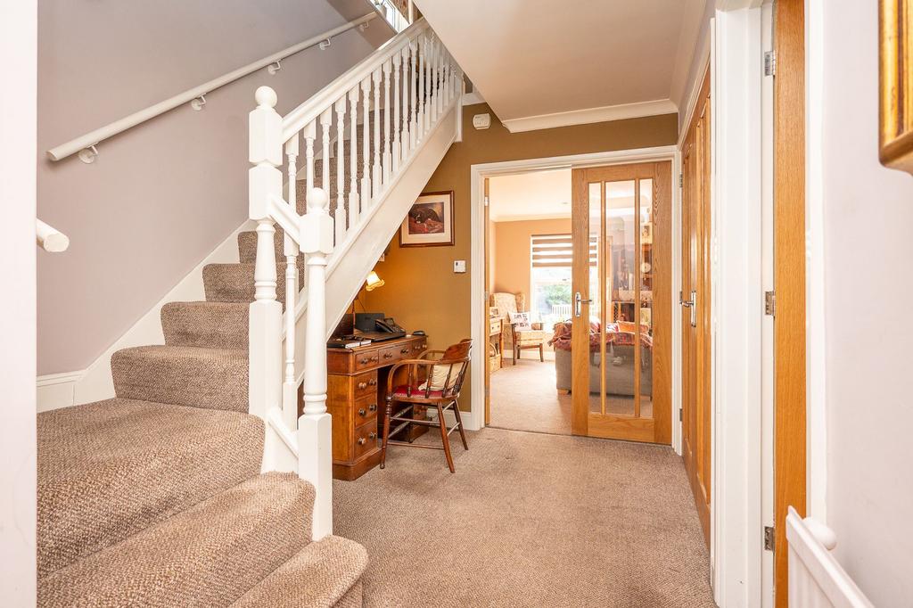From the hall, glazed oak doors lead into the kitchen/breakfast room and the lounge, with an additional oak door opening to the WC. The hall features carpeted flooring, a telephone point, and a wall-mounted radiator, with stairs rising to the first floor. There is also a study area beneath the stairs and a useful storage cupboard.
