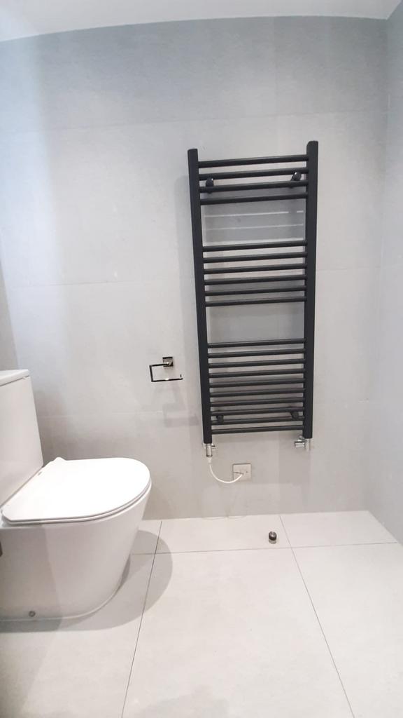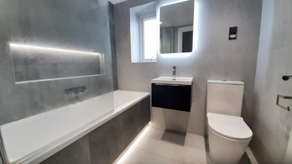 The bathroom is a modern tiled bathroom suite with LED strip lighting and a heated towel rack.
