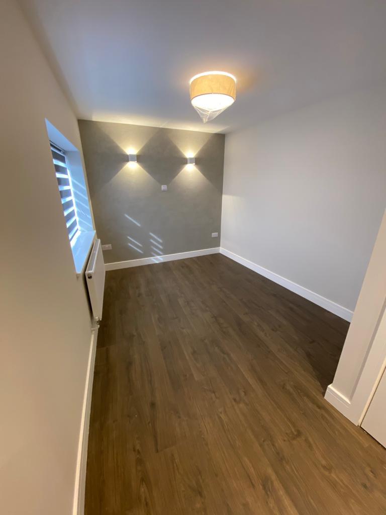 The BEDROOM is a bright and spacious double bedroom with a feature wall, fitted wardrobes and wall lamps as well as night and day blinds.
