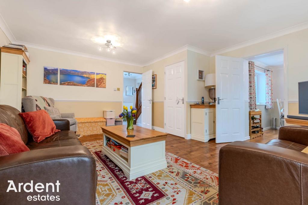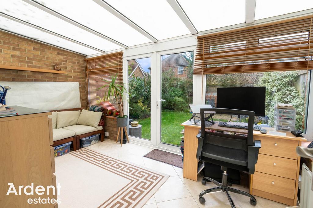 To the rear of the property, the living room provides a generous and comfortable reception space with ample room for both relaxing and entertaining. French doors open directly into the conservatory, creating a bright additional living area overlooking the garden and offering flexibility for use as a home office, playroom or garden room.