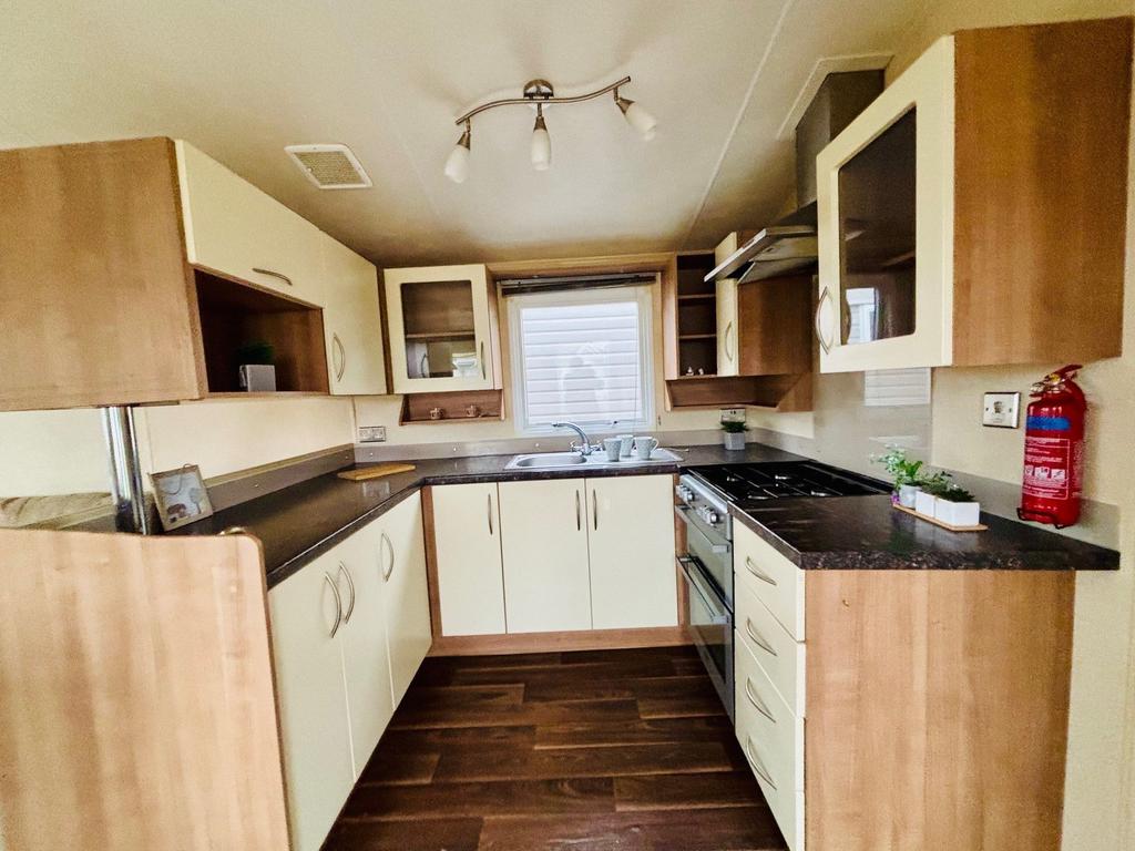 Inside, the caravan features a bright open-plan lounge and kitchen area, creating a welcoming space to relax after a day exploring the local coastline. The fully fitted kitchen includes a fridge-freezer, while double glazing and central heating help keep the caravan comfortable across the seasons.