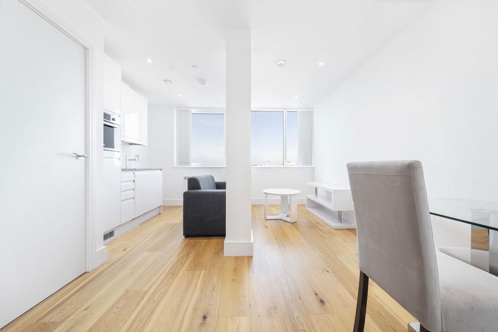 This modern eighth-floor studio features a video entryphone system and lift access within a secure, purpose-built building. The interior includes a washing machine and essential white goods for convenient living.
