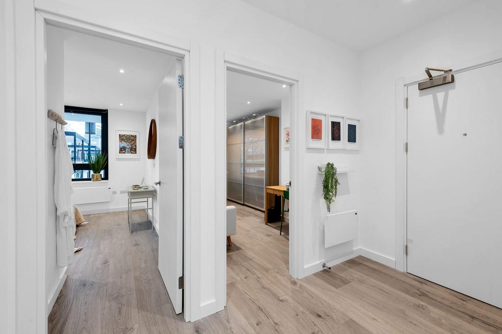 The apartment features a well-planned layout with three good-sized bedrooms, including a spacious principal bedroom with en-suite bathroom. Two further bedrooms offer excellent flexibility for family living, guests, or home working, while a large built-in storage cupboard in the hallway enhances everyday practicality.