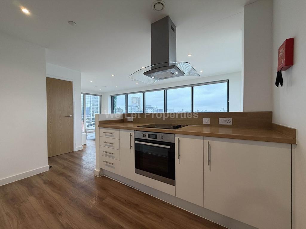 The apartment features a thoughtfully designed layout with an expansive open plan living, dining and kitchen space. Floor to ceiling windows flood the space with natural light and frame striking panoramic views, creating an inviting and sociable environment ideal for both relaxing and entertaining. The modern kitchen is fitted with a combination of white wall and base units, complemented by warm wood effect worktops, and features integrated appliances including fridge freezer, oven and hob. Leading off the kitchen, a private balcony provides tranquil outside space in the hustle and bustle of the busy city. A spacious utility cupboard houses a freestanding washer dryer and provides additional storage space, enhancing functionality without compromising style.