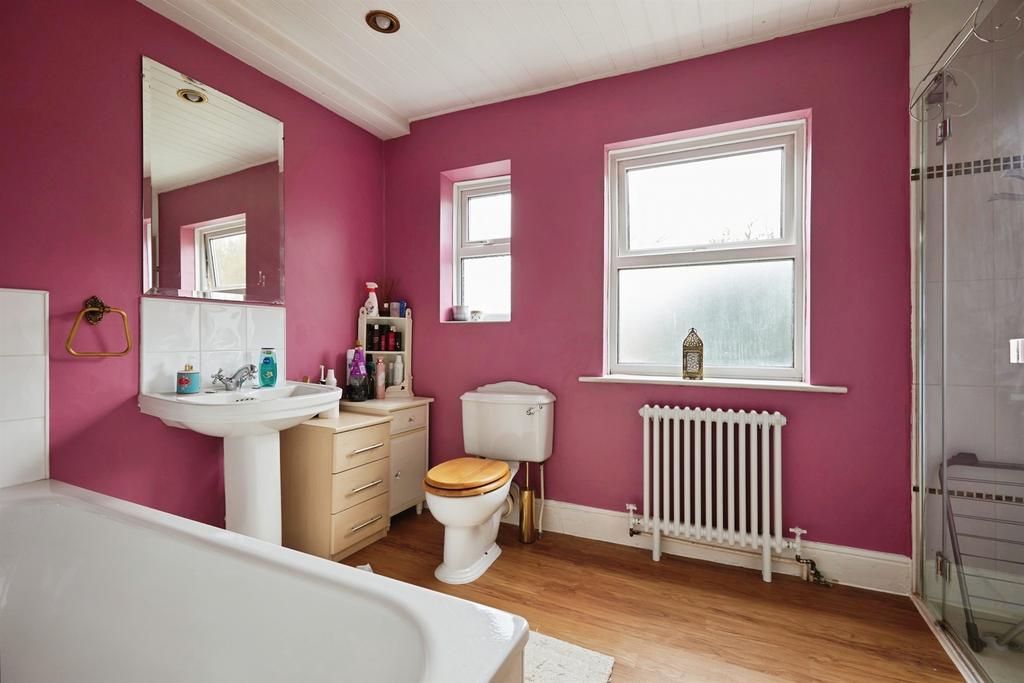 Comprising panel enclosed bath with mixer tap and hand held shower attachment, separate shower cubicle, pedestal wash hand basin, WC, two windows rear aspect