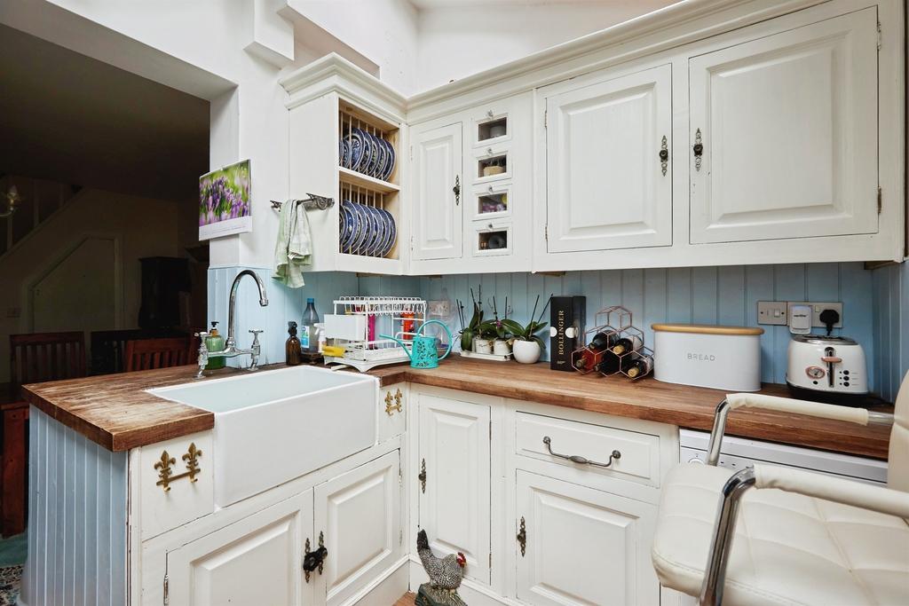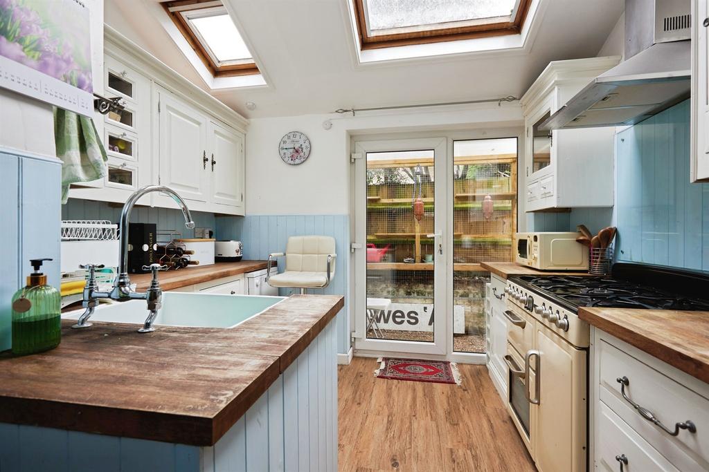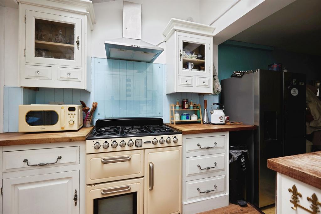 Comprising wall and base units with wooden work top above, Belfast sink with mixer tap, space for range style cooker with extractor above, spaces for fridge freezer & slim line dishwasher, door rear aspect.