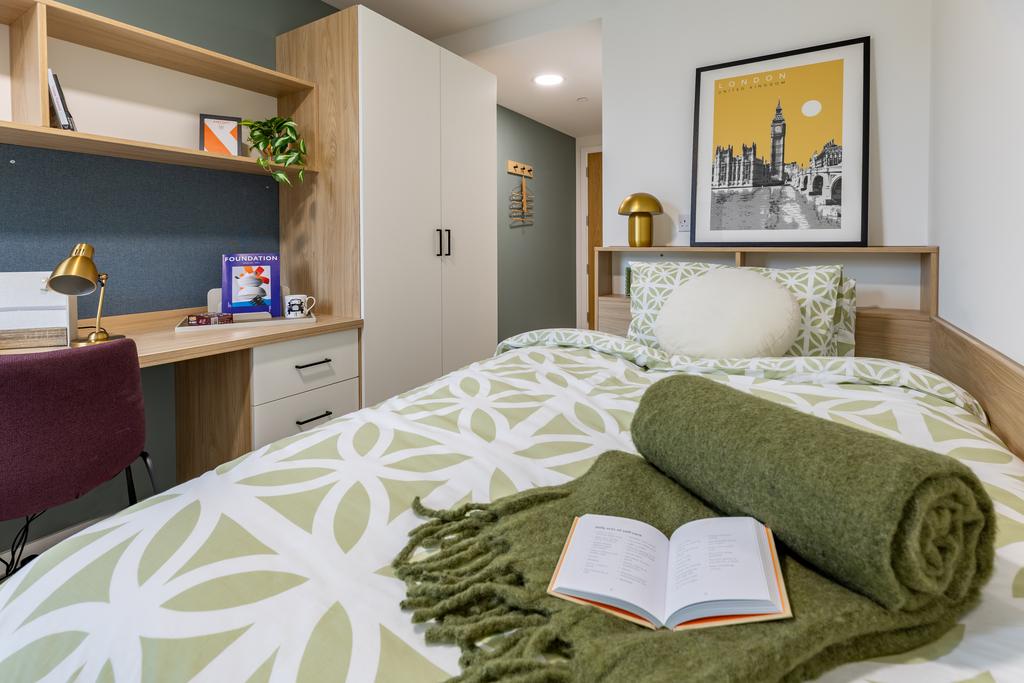 Share a stylish apartment while keeping your own space. Your private en suite bedroom comes with a comfy small double bed, floor-to-ceiling wardrobes, full-length mirror, oak desk and desk chair in your own study area, and plenty of storage. You have your own en suite bathroom with shower, floating toilet and sink, a shaving point and mirror-fronted cupboard.