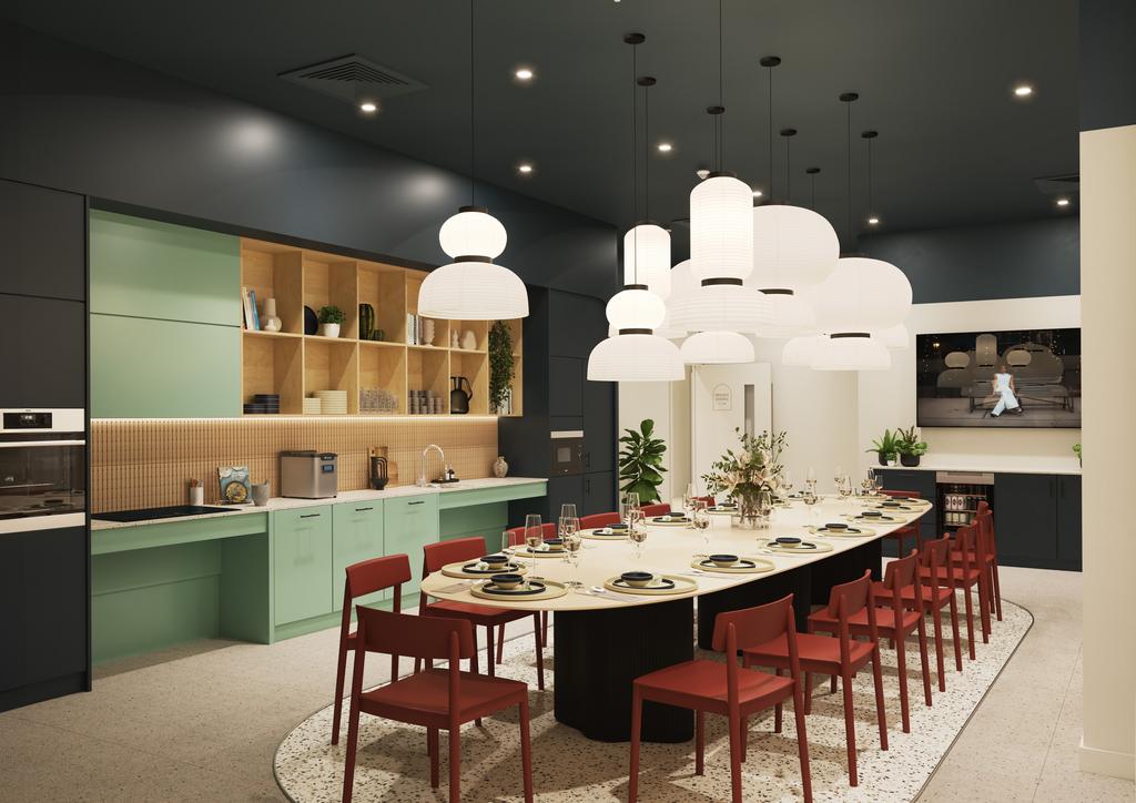 Step outside your room into a shared kitchen and lounge space. This luxury communal area features three sofas, dining tables with chairs, and a fully equipped kitchen. With ample cupboard and storage space, it’s perfect for cooking, dining a socialising with your flat mates.