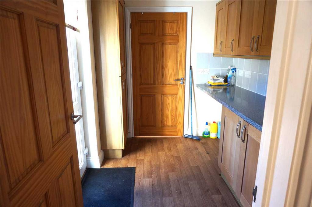 With wall and base units matching the Kitchen, space for an undercounter fridge or freezer, wine rack, walls tiled to splashback, wood effect laminate flooring, uPVC framed and glazed external door leading out to the rear decked area, internal door through to :