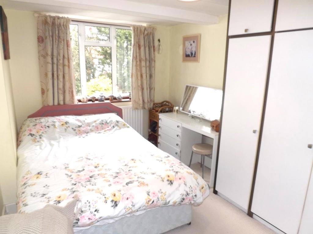 A spacious bedroom with range of fitted wardrobes. Large double glazed bay window with leaded light inlay.