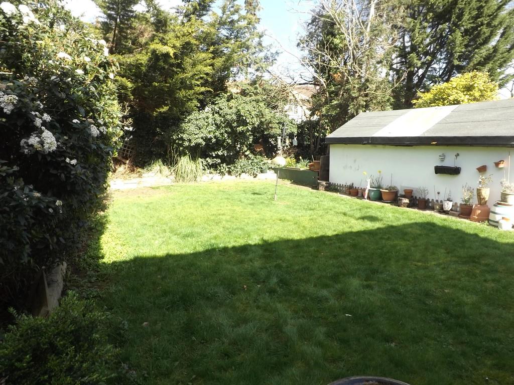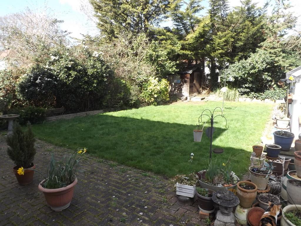 With large side access. Patio leading onto lawn with extensive flower borders and wooden shed to rear.