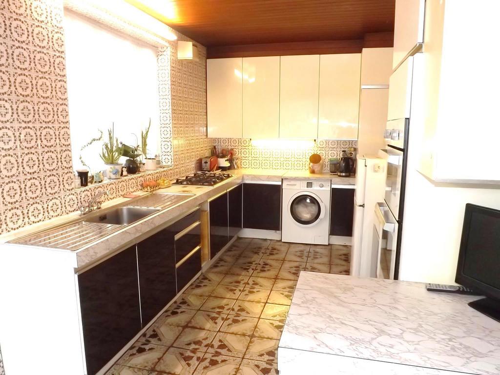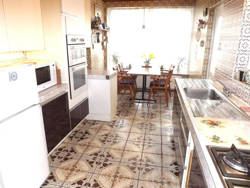 With door to side and space for kitchen table and chairs. Range of wall and base units with stainless steel sink unit with mixer taps and stainless steel drainer to either side. 1 ½ CDA oven with separate six burner gas hob. Tiled walls and flooring.