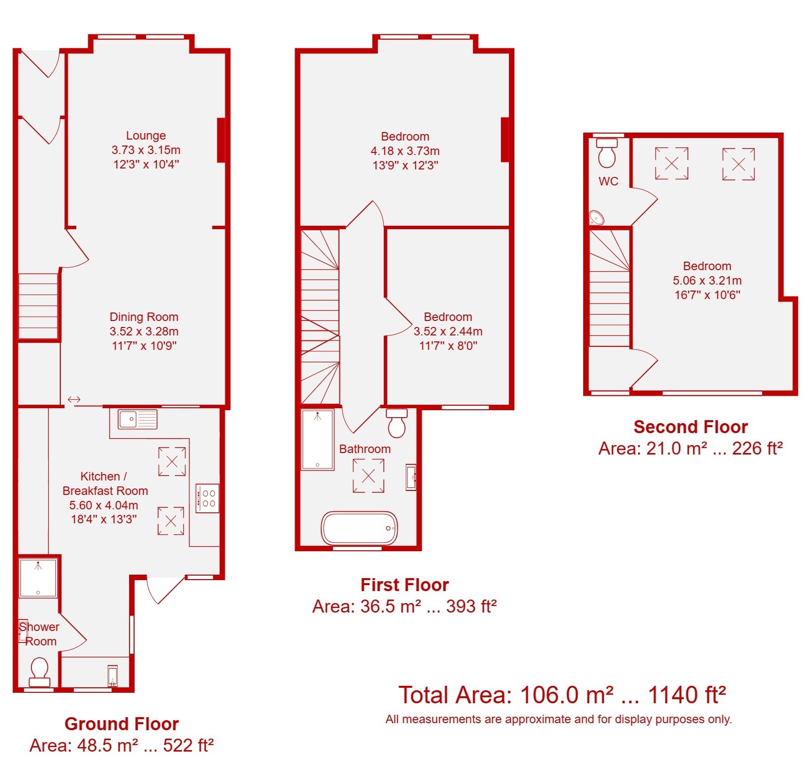 On the first floor are two generous double bedrooms, including one with a full wall of built-in wardrobes, along with a luxurious family bathroom complete with roll-top bath and walk-in shower.
