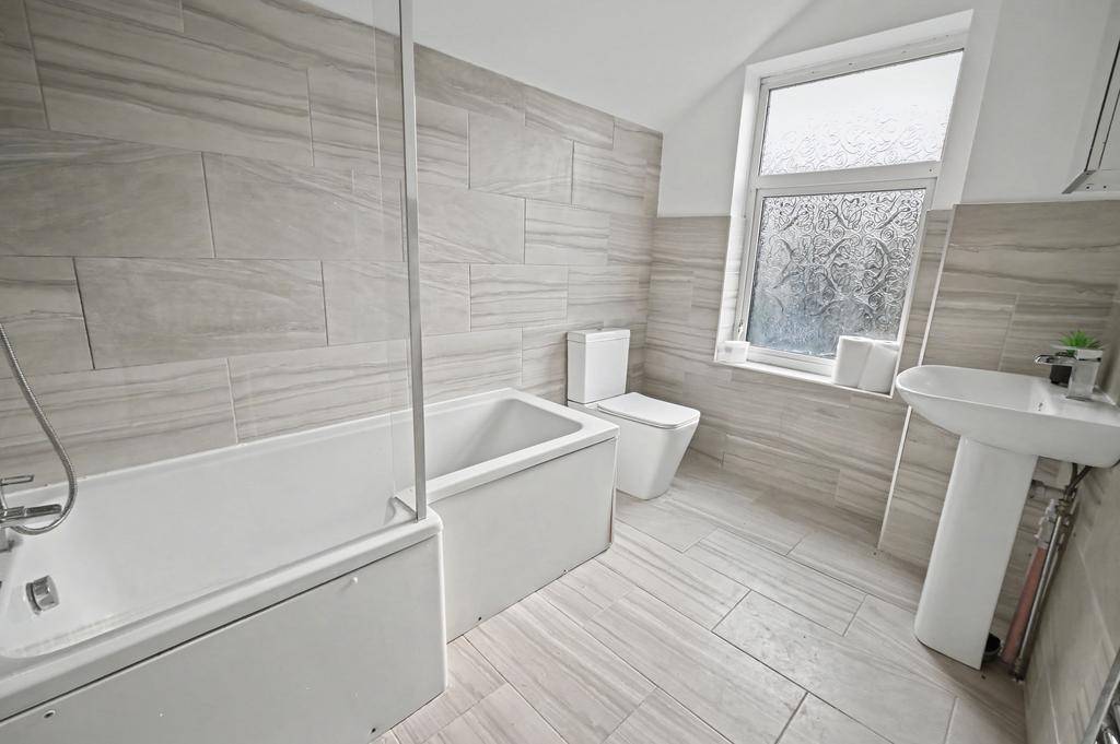 Bathroom: 9’4’’ (2.85m) x 6’6’’ (1.98m) Fitted with a modern white suite comprising P-Shaped panelled bath with shower unit & screen, low level WC, pedestal wash hand basin, chrome heated towel rail, part tiled walls & flooring, extractor fan and double glazed opaque window to rear.