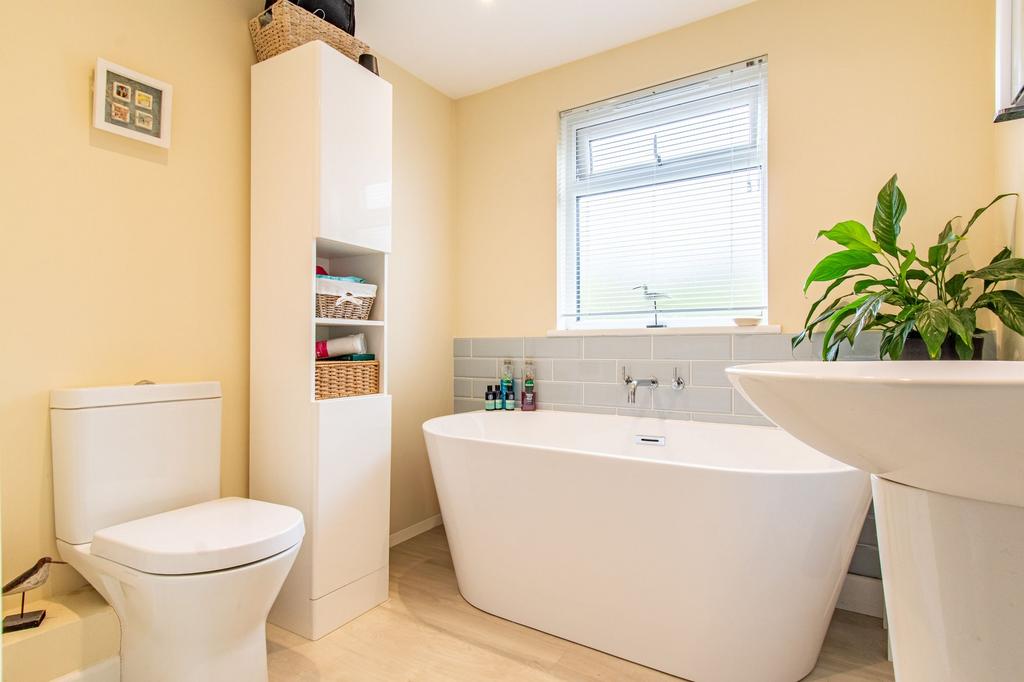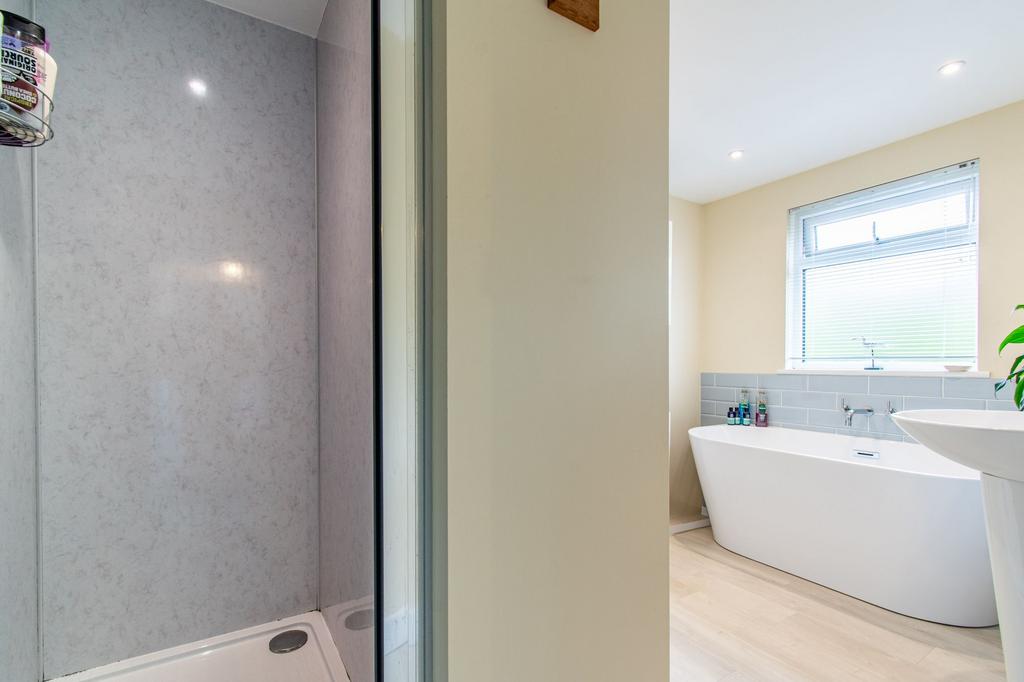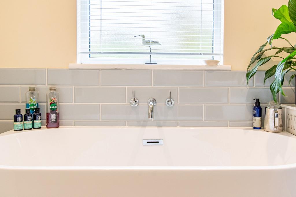 Upstairs, the property offers two spacious double bedrooms, both enjoying views across the surrounding countryside and a beautifully appointed bathroom complete with a freestanding bath and a separate oversized shower.