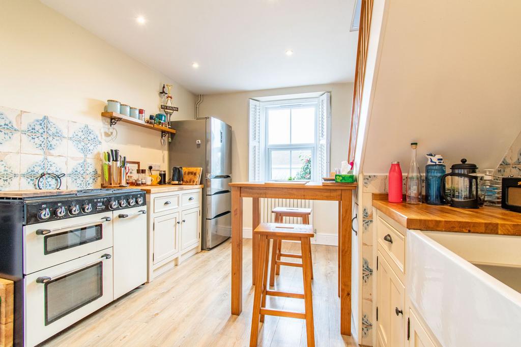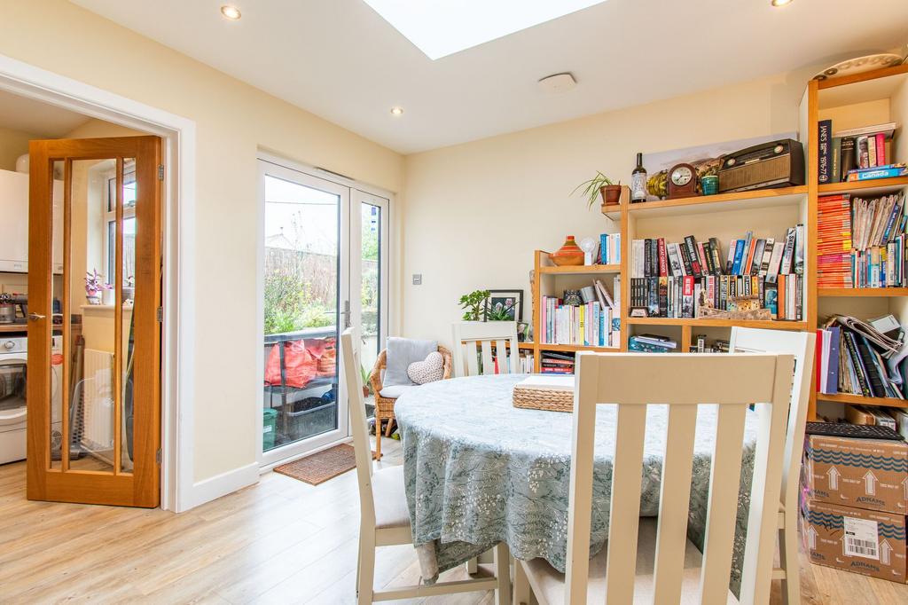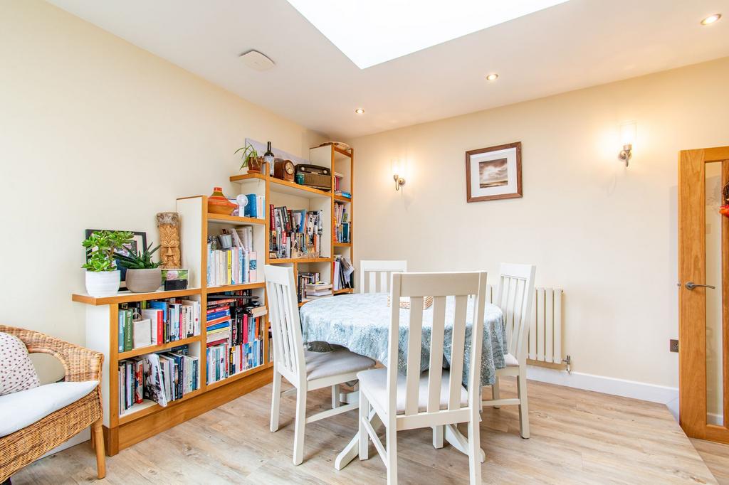 The heart of the home lies in the kitchen/breakfast room, showcasing rustic charm with exposed brickwork, a Belfast sink, oak worktops, and space for a range cooker. The adjacent dining room is flooded with natural light thanks to its glass lantern roof and offers direct access to the rear garden, making it ideal for entertaining.