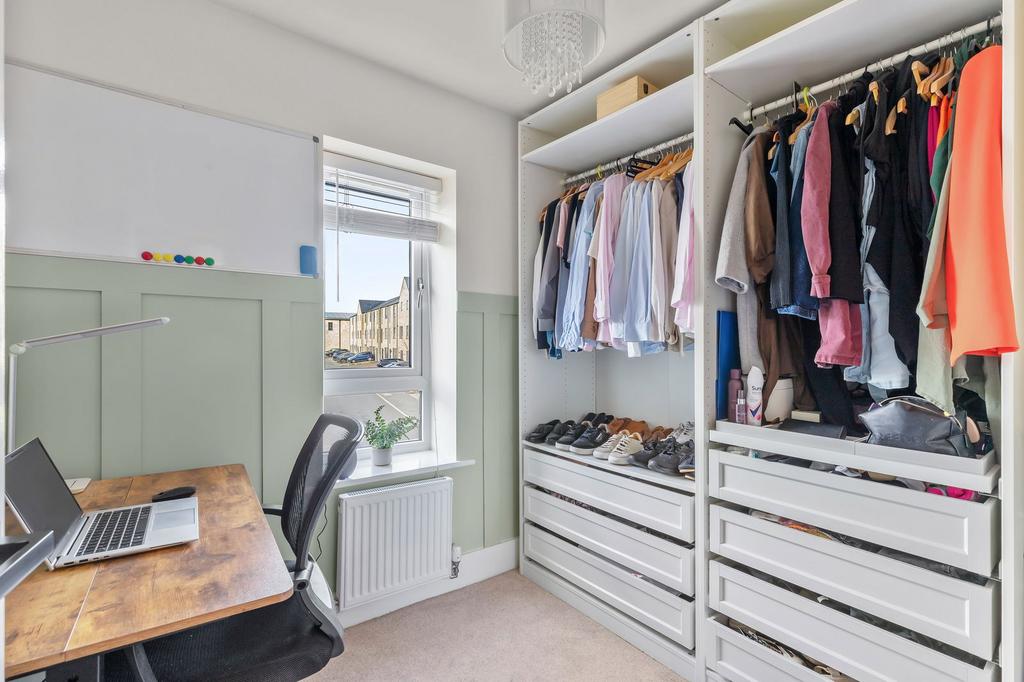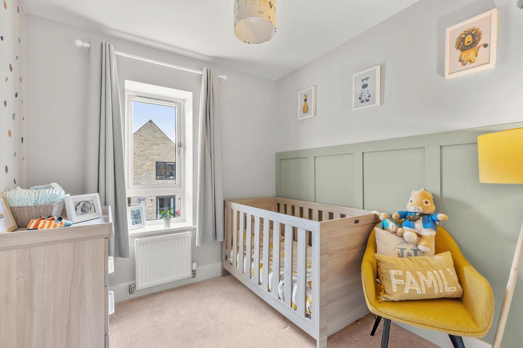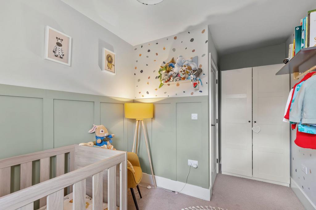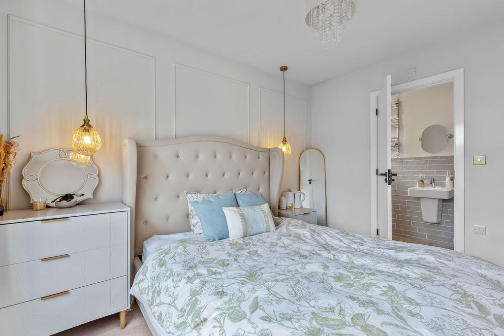 The first-floor landing leads to four well-proportioned bedrooms. The principal suite benefits from a private en-suite, while the second and third bedrooms accommodate doubles. The fourth bedroom is suited to a nursery or home office. A loft ladder provides access to a partially boarded loft for additional storage.