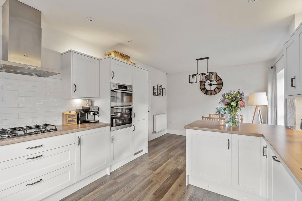 Accessed via a stylish composite door, the entrance hall provides an immediate sense of space, with an understairs storage cupboard and a ground-floor WC. The dining kitchen is fitted with modern units, integrated appliances, and a breakfast bar, with ample room for a dining table. To the rear, the lounge is dual-aspect, with patio doors opening onto the fully enclosed south-facing garden.