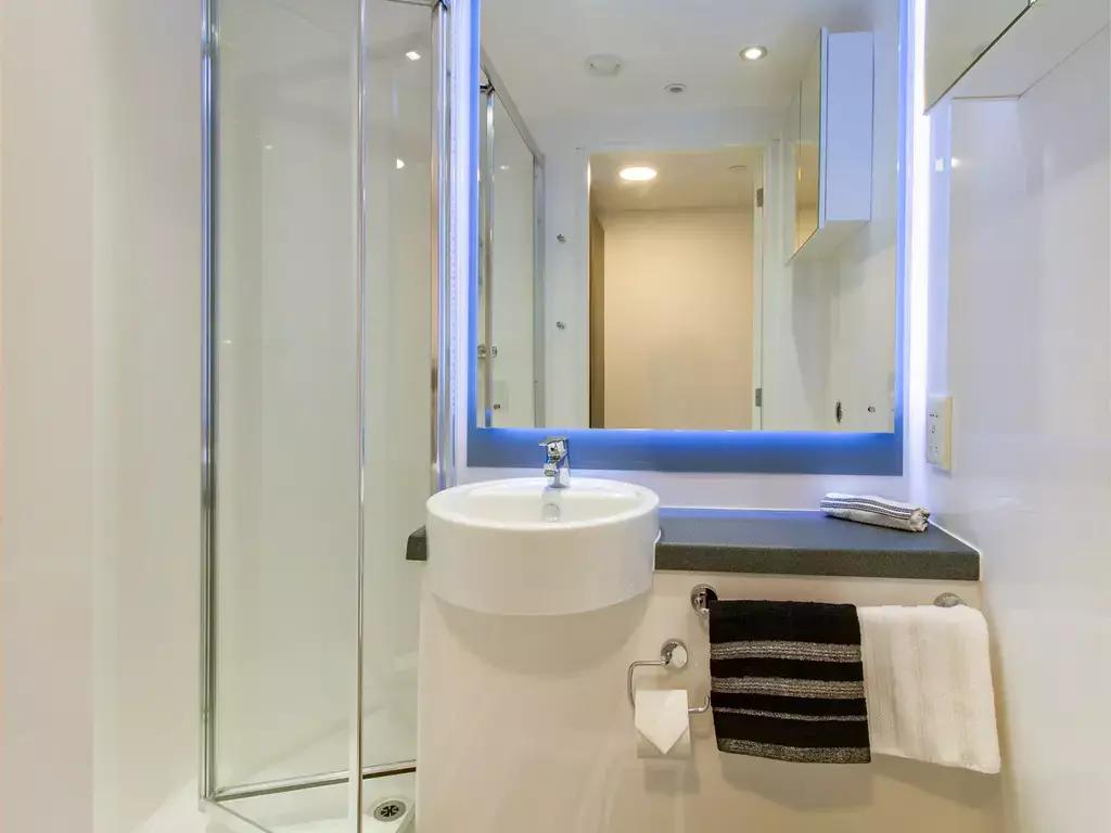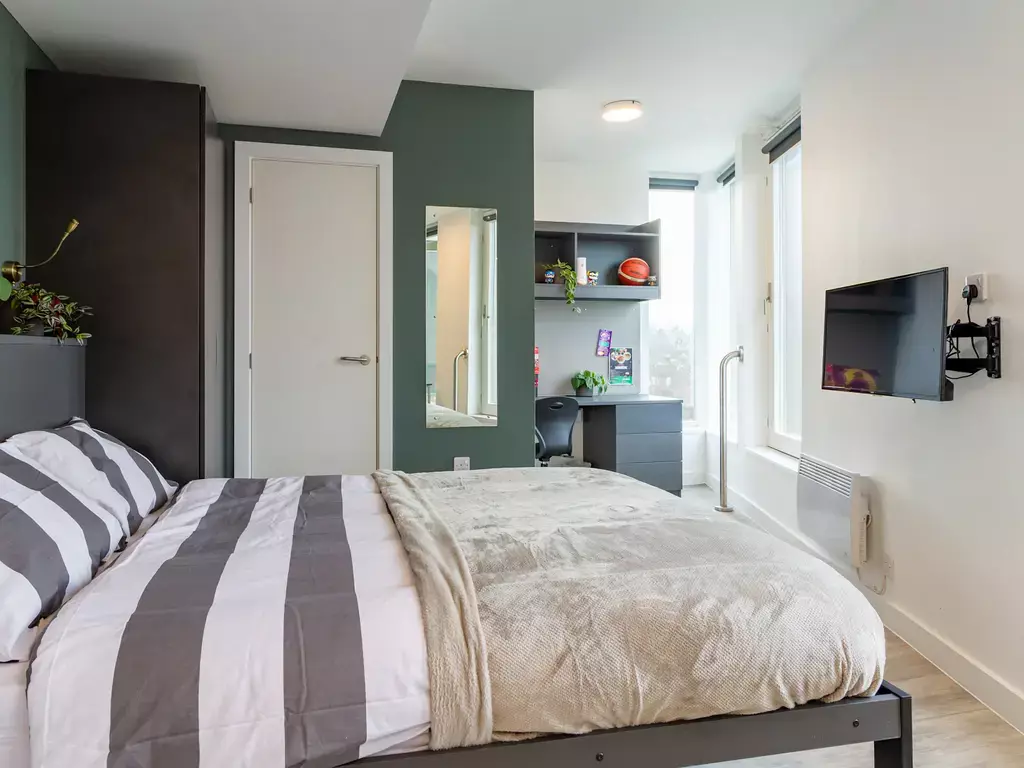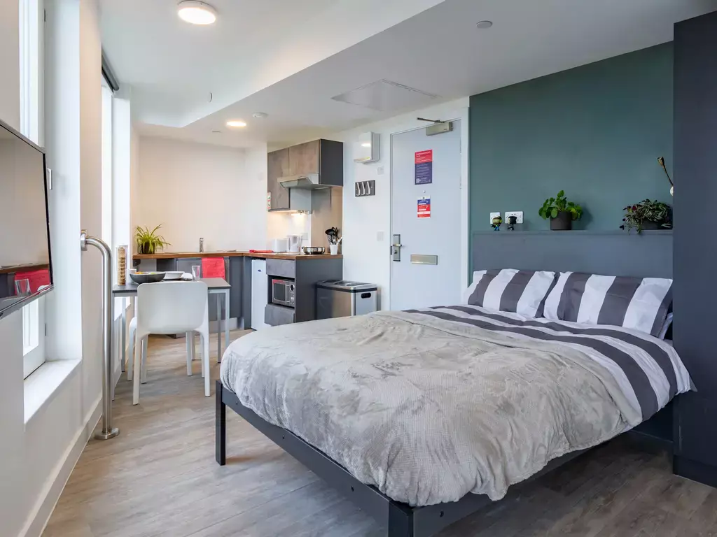 Upgrade your space with the Silver Studio. It includes everything from our popular Bronze Studio, plus a little extra room to stretch out and make it your own. Featuring a double bed, large study area with plenty of storage, a fully equipped mini kitchen and a PC monitor to connect your laptop. Perfect for work and streaming!