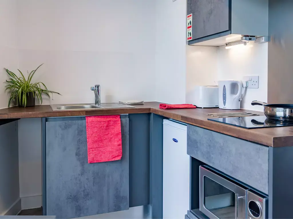 Benedict’s Gate offers spacious en suite rooms and stylish studios, amongst a wealth of social areas for you to enjoy! Each en suite room comes with a comfy small double bed, en suite shower, loads of storage, plenty of workspace and a shared kitchen and living area with a TV to enjoy with your flatmates. Our studios include all of the same great features, but also offers your own mini-kitchen and monitor screen to connect to your laptop. Plus, we don’t charge extra for couples wanting to share!