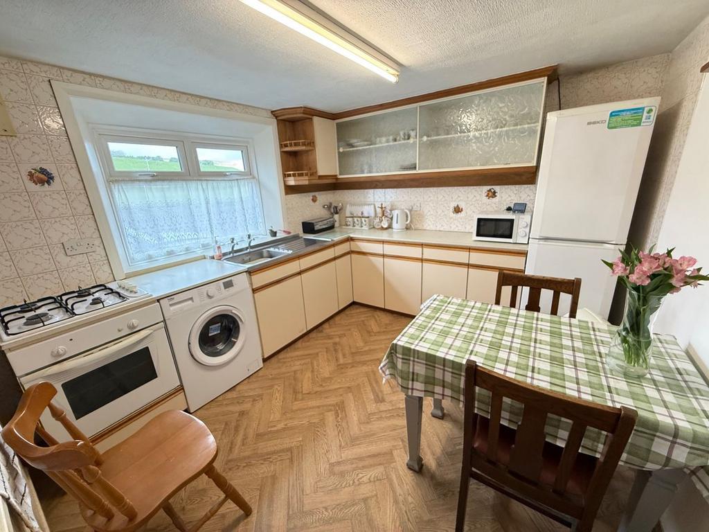 With stainless steel sink unit, range of wall and base cupboards with laminated work surface, integrated gas hob, underbuilt oven and plumbing for automatic washing machine, space for fridge freezer and single radiator.