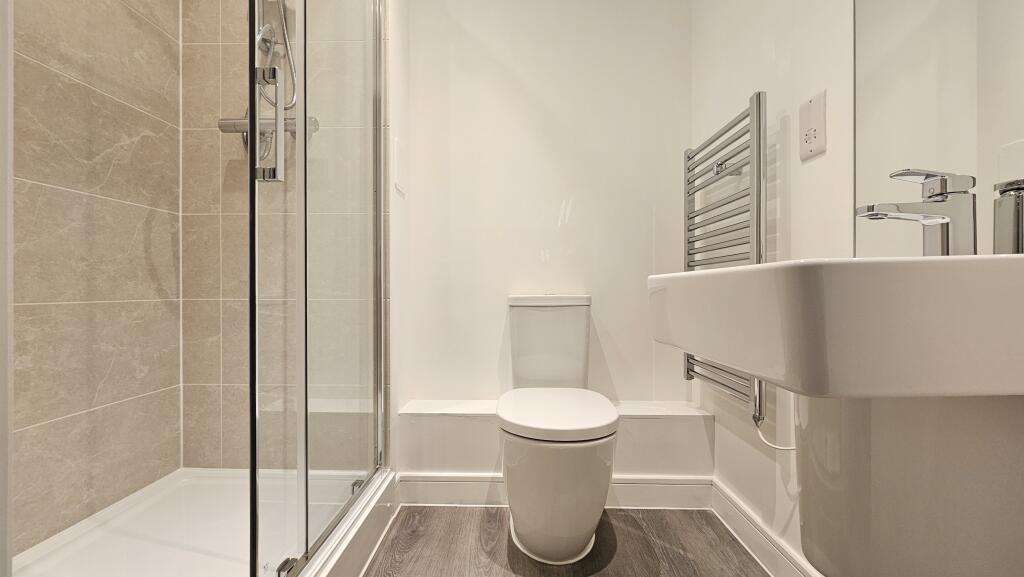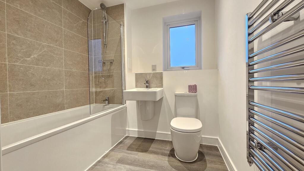 • A modern family bathroom is conveniently located off the hallway and finished with stylish fixtures, providing both practicality and comfort for residents and guests.