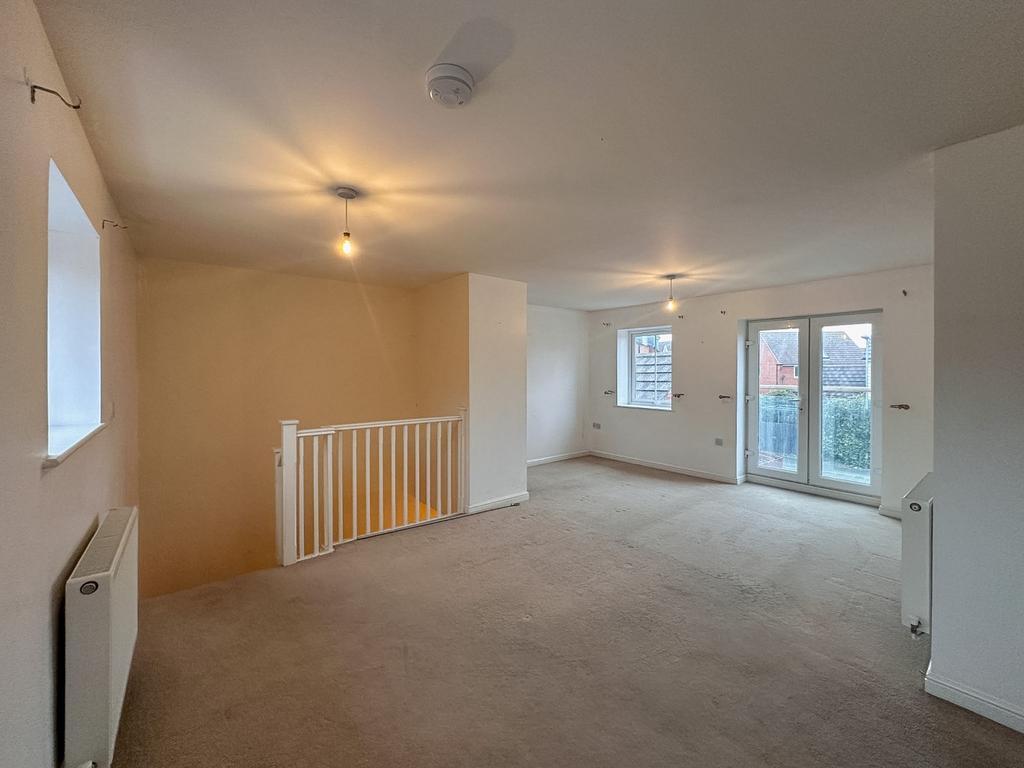 Upstairs, the main living accommodation is bright and well-proportioned. A spacious open-plan lounge and dining area forms the heart of the home, enhanced by two patio doors opening onto a Juliet balcony, allowing plenty of natural light to flow through the space. There is also a separate modern fitted kitchen, offering ample cupboard and worktop space for everyday living.