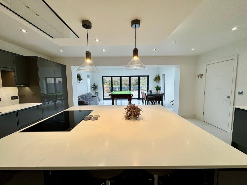 Spacious open plan from kitchen, dual aspect full height windows to sides, skylight lantern, bi-fold doors opening onto patio area.