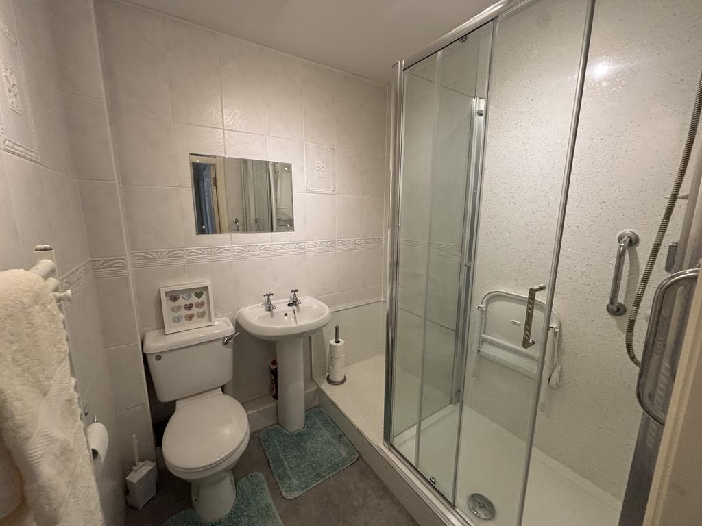 Bathroom 3 piece suite comprising shower cubicle, pedestal hand basin and low level WC. Heated towel rail and extractor fan.