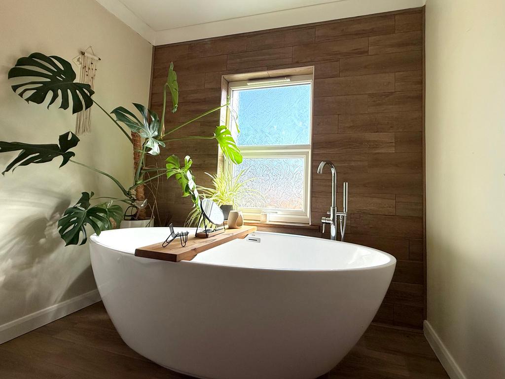 Moving upstairs, the king-size master bedroom benefits from two double-glazed windows that allow plenty of natural light into the room and includes matching built-in wardrobes. The second double bedroom is currently used as a home office but can easily be adapted back into a bedroom. One of the main highlights of the home is the spacious family bathroom and shower room. It features an elegant oval-shaped bathtub positioned beside a privacy double-glazed window, a separate shower cubicle with both a rainfall and handheld shower, along with a sink and toilet.