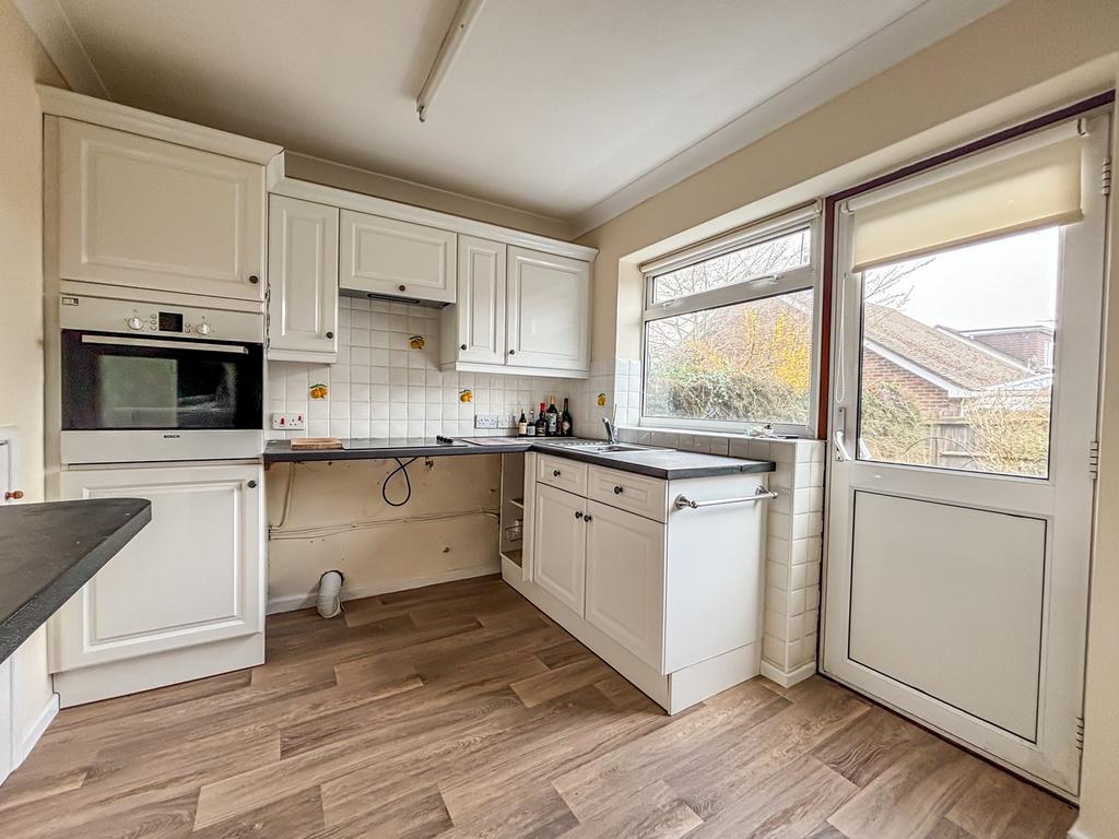 11' 0" x 8' 1" (3.35m x 2.46m) with window and glazed door to patio and garden and fitted with a range of base and wall mounted kitchen cabinets incorporating cupboards and drawers with spaces and plumbing for appliances. There is a fitted oven and a working surface incorporating a ceramic hob with extractor fan above and a stainless steel sink with mixer tap and drainer. Large understairs storage cupboard and separate large cupboard housing the gas fired boiler.