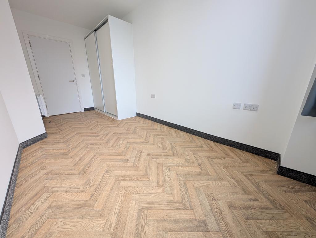 The property offers a modern fitted kitchen with sleek white units, an integrated oven and hob, and plenty of storage space. The open-plan living area provides a bright, flexible layout, while the bedroom benefits from a built-in double wardrobe for added convenience.