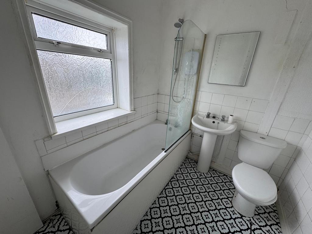 Comprising of a panelled bath with electric shower and screen, Pedestal wash hand basin, Low flush WV, Part tiled walls, uPVC double glazed window