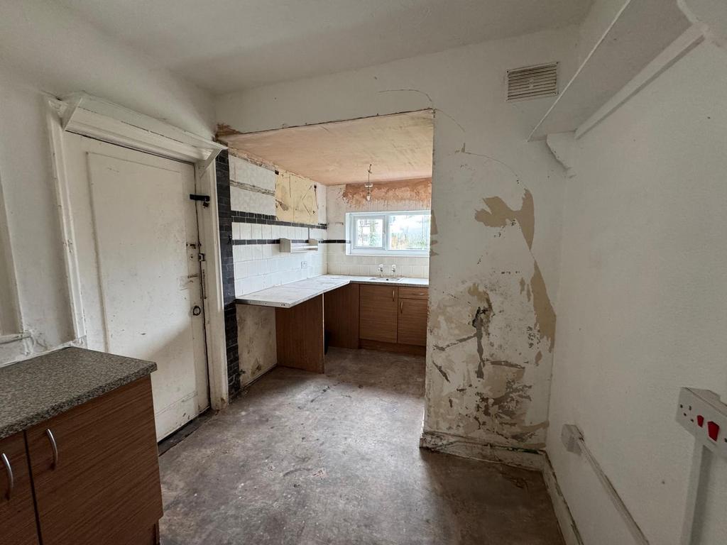 The kitchen is in need of full refurbishment, currently there is a range of wall and base cupboard units with complimentary roll edge work tops, and a single drainer stainless steel sink , uPVC double glazed window, door leading to rear garden.