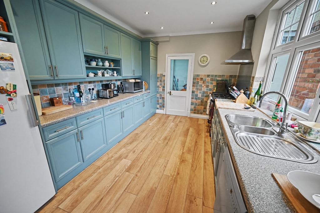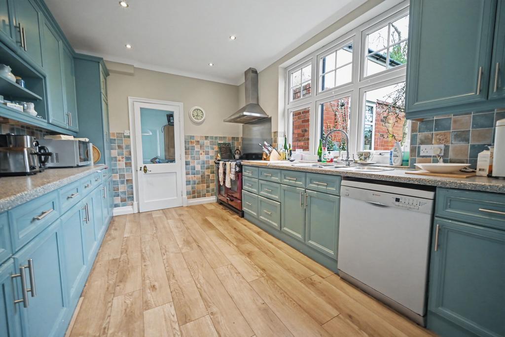 Fitted with a matching suite of traditional units comprising a range of base cupboards, drawers & suspended wall cupboards, matching laminate worktops with stainless steel 1½ drainer sink unit, recess & gas point for range style cooker with stainless steel extractor hood over, recess for fridge freezer, pluming for dishwasher, recessed ceiling spotlights, coved ceiling, laminate flooring and double glazed window to rear.