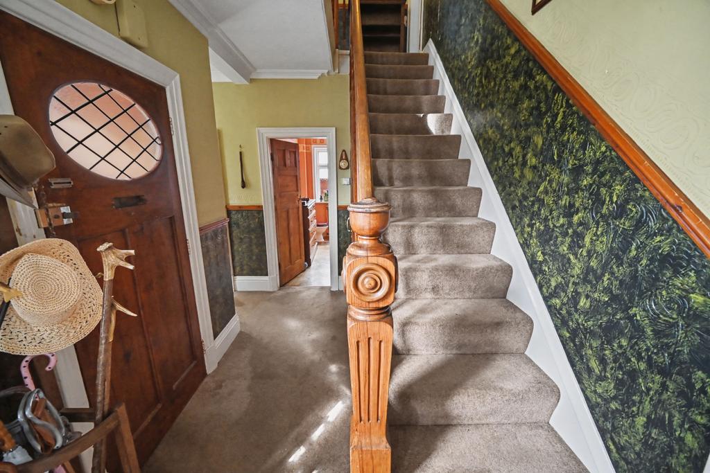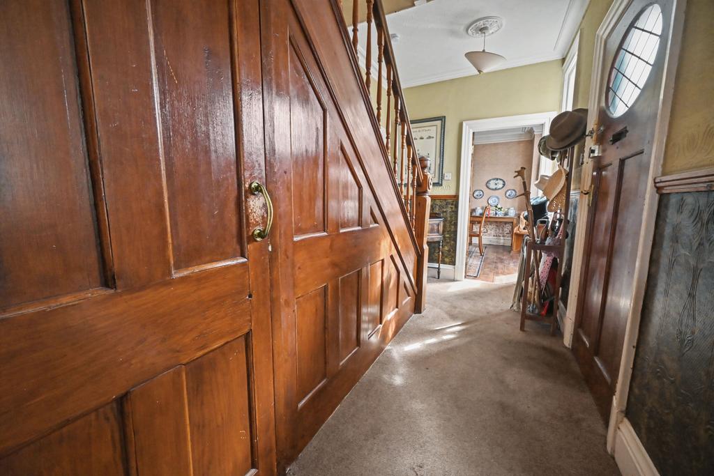 Entrance Hall: Hardwood front door with leaded opaque window, radiator, coved ceiling, hardwood glazed window to front and wood panelled staircase to first floor with storage cupboard below