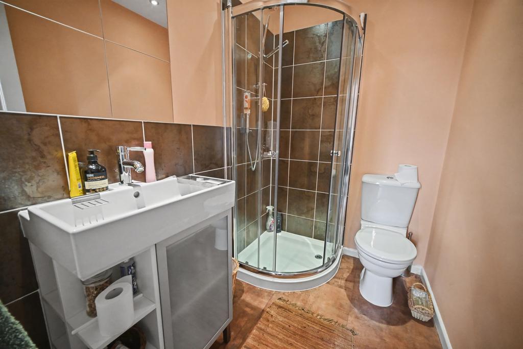 Three radiators and double glazed windows to side & front. Ensuite Shower Room: 4’11’’ (1.49m) x 7’1’’ (2.15m) Fitted with a white suite comprising corner shower enclosure, low level WC, vanity unit, chrome heated towel rail, recessed ceiling spotlights, vinyl flooring and extractor fan.