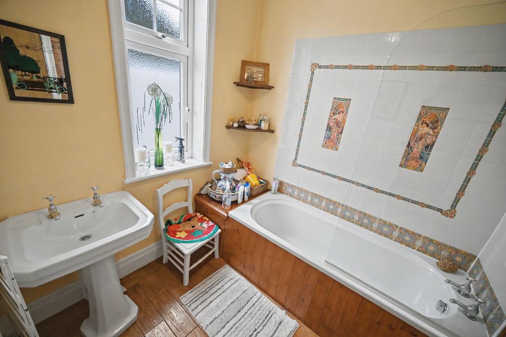 Fitted with a traditional white suite comprising panelled bath with electric shower unit over & side screen, pedestal wash hand basin, radiator, part tiled walls, wood tiled flooring and double glazed opaque window to side.