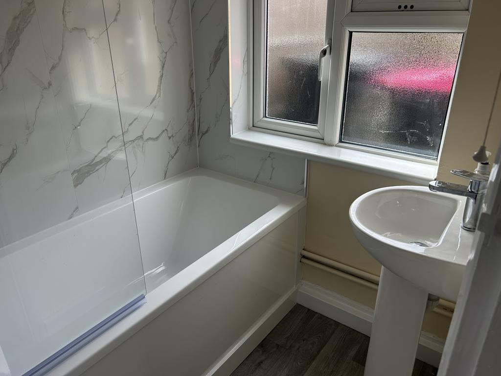 Double glazed patterned glass window to rear, White panelled bath with shower over, pedestal wash hand basin with chrome mixer tap, radiator, part tiled walls, vinyl flooring.