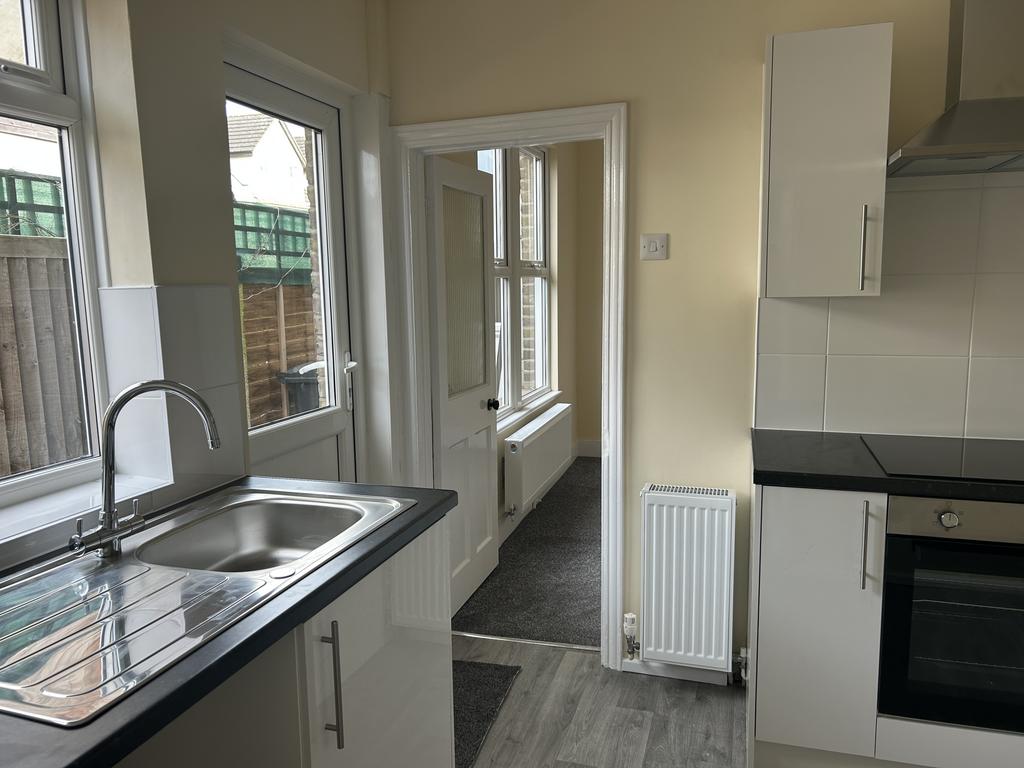 Double glazed door to side, access to rear garden, double glazed window to side, range of matching eye and base level units, working surfaces, stainless steel sink unit with mixer tap, fitted oven and hob with stainless steel extractor over, space for washing machine and fridge/freezer, small radiator, part tiled walls, vinyl flooring.