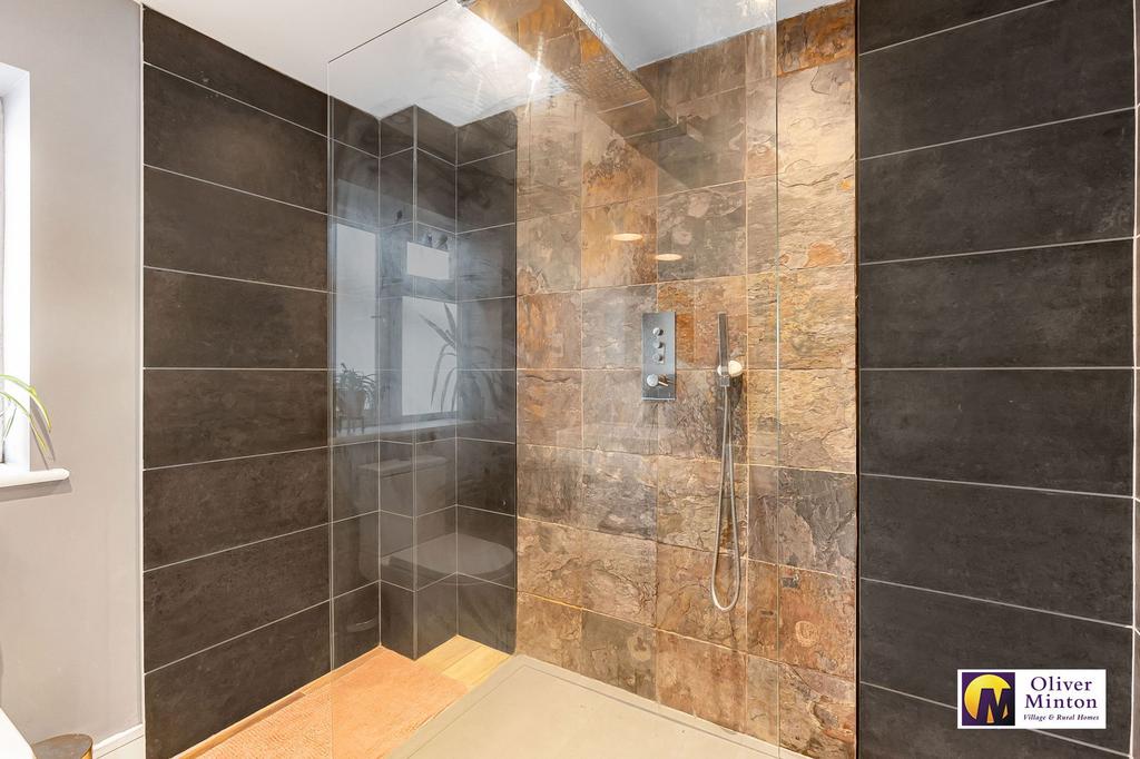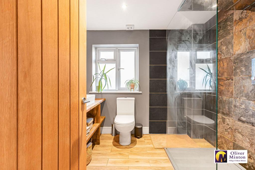 Stylishly fitted with twin wash hand basins on attractive wooden stand with shelving below. Large shower area with glazed screen. WC. Obscure uPVC double glazed window. Extractor fan. Inset ceiling lights.